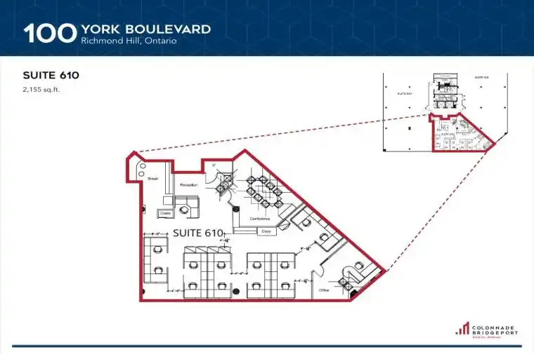 Prestigious office space on the 6th floor, combination of offices, meeting rooms, and open space. The building offers transit at your doorstep as well as easy access to a large variety of restaurants, cafes, and other amenities. Ample free parking. Amazing skyline views of richmond hill. Term can be extended direct with landlord. Floor Plan Attached. Original Lease Till Oct 31, 2028. Office Furniture Negotiable. **EXTRAS** Rent $6,948.26/ Monthly (Include Tmi & Hst ), Lease Term To Oct 31, 2028.