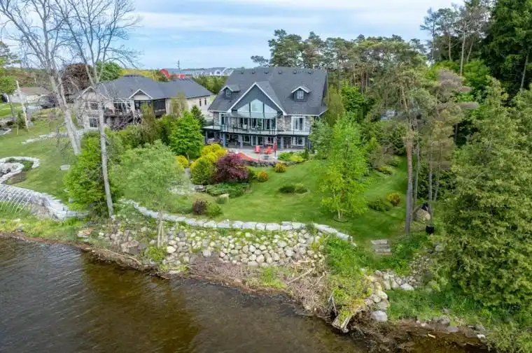 Welcome to this stunning, 10-year-old executive waterfront home on the Bay of Quinte, where modern comfort meets secluded elegance. Tucked behind a nicely treed, well-landscaped lot for year-round privacy, this three-bedroom residence offers direct access to a clean, swimmable rocky shoreline. Enjoy peaceful waterfront living just 9 km from downtown Trenton and 20 km from Belleville. The principal living area breaks free of the conventional box shape, unfolding in a dynamic, fan-like layout that maximizes both interior space and panoramic lake views. Soaring cathedral ceilings and gable-facing windows amplify the sense of volume, while rich hardwood floors and French doors seamlessly connect the great room to the open-concept main floor. A gas fireplace adds cozy warmth, and the chef’s kitchen, appointed with cherry cabinetry and quartz countertops, flows effortlessly into the dining and living spaces. Retreat to the spacious primary suite, complete with a walk-through closet, luxurious 4-piece ensuite, and private, water-facing deck. A main-floor pantry and laundry room enhance daily convenience. Below, the walk-out lower level features a family room that opens onto a sheltered patio beneath the expansive covered deck a perfect outdoor living space protected from the elements and ideal for entertaining, relaxing, or simply enjoying the views. Two additional bedrooms, a versatile office area, and beautifully manicured grounds complete the offering. Whether you seek a full-time haven or a luxurious retreat, this Bay of Quinte home delivers refined living, breathtaking sunsets, and unparalleled privacy in a naturally beautiful setting. Home, well and septic inspection available. You can build a 2-car garage at the end of the driveway.