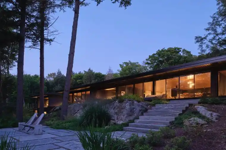 A rare opportunity to acquire one of Haliburton’s most exquisite properties. Discover a coveted offering with unparalleled privacy in the exclusive enclave of Lipsy Lake. With only 33 properties, the lake is quiet and offers a hard to find alternative to those in search of supreme tranquility. This meticulously crafted contemporary estate is nestled on over 14 acres, with 545ft of prized, west-facing frontage. Spanning 130ft, the design of the main dwelling is informed by nature and integrated into the rugged beauty of the Canadian Shield. Designed by MafcoHouse and utilizing post and beam construction, the need for load bearing walls is eliminated. Vast expanses of floor to ceiling windows inspire a deep connection to nature. A glass corridor provides a divide between the living space and primary suite, with a glass bridge connecting to a two story guest wing. A covered carport with entrance to the lower level of this wing doubles as a large private patio to the bedroom above. Relaxed luxury is rooted in the complex yet simple and intentional design throughout, where every detail has been considered. With impeccable finishes from the warmth of the Hemlock clad ceiling, to the bespoke oak millwork, the home provides a generous space for entertaining as well as intimate family living. Two exterior screened-in rooms expand the interior living space to the outdoors. The glass facade reflects the natural surroundings, blurring the home from the lakeside view. Architecturally landscaped, cut granite steps, landings, and patios are meticulously integrated into the topography and lead to the water’s edge. Beyond the main dwelling, an accessory structure houses a two car garage, gym, full bathroom, and an almost 600sqft rec room. A basketball sports court and groomed trails complete this exceptional offering. More than a home, 1298 Lipsy Lake Drive is a place to exhale – where the harmony of intentional design and profound stillness awaken a deeper sense of luxury.