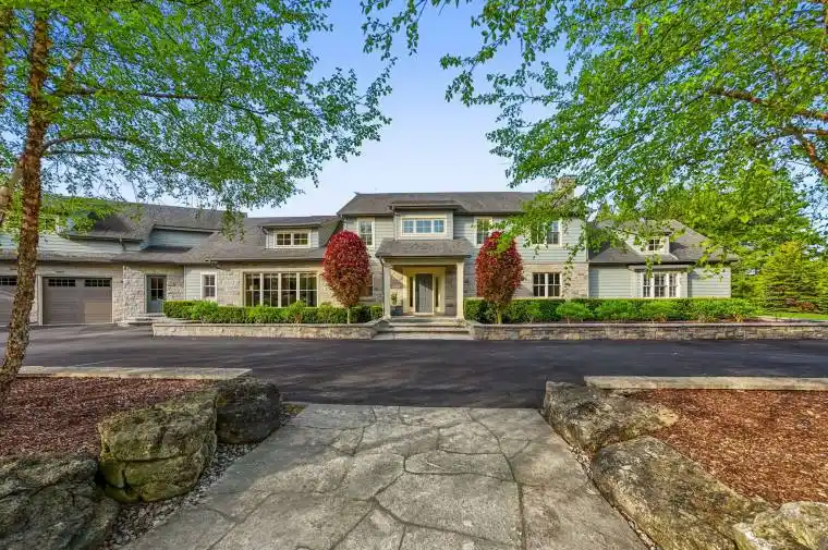This fabulous rural retreat provides the ultimate escape from the everyday. As you approach this custom-built home, the stately gates, charming wood siding, stone accents and circular drive set the tone for the perfect country package beautifully secluded from the world. Rebuilt in 2006, this Bungaloft, with its convenient main floor primary suite design boasts a thoughtful, open layout that seamlessly connects spaces. The primary suite offers incredible views, a spacious walk-in wardrobe room and a lovely ensuite. The expansive Great Room flows into a modern gourmet kitchen with a stunning view from the kitchen sink! A cozy stone fireplace warms the dining room, while the home office, featuring custom woodwork, creates an ideal work-from-home setting. The main floor extends to a show stopping ~1,000 sq ft rear covered patio w/retractable Phantom screens, perfect for year-round outdoor living, complete with a built-in fireplace. Upstairs, one staircase leads to a loft area with two additional bedrooms and baths while the other staircase takes you to a home theatre or private bonus/guest room. The finished lower level includes two more bedrooms, a full bathroom, a large rec room, a cozy wood stove plus two entrances and oversized windows. Set on almost 34 acres, the stunning grounds feature natural stone paths, a picturesque stream running ~1,000′ and maintained trails through the trees. The property also features an irrigation system. The incredible 3,000 sq ft custom-designed insulated garage/workshop with heating and water is perfect for a car enthusiast or woodworker. Additional features include an 18kw Generac generator, new Lennox Signature Series heat pump and Furnace (2025) along with a new vanEE ERV (energy recovery ventilator) (2025), and 4 new garage doors (2025). Over 5,100 sqft per MPAC This one-of-a-kind property, lovingly maintained in pristine condition, offers a peaceful sanctuary like no other!