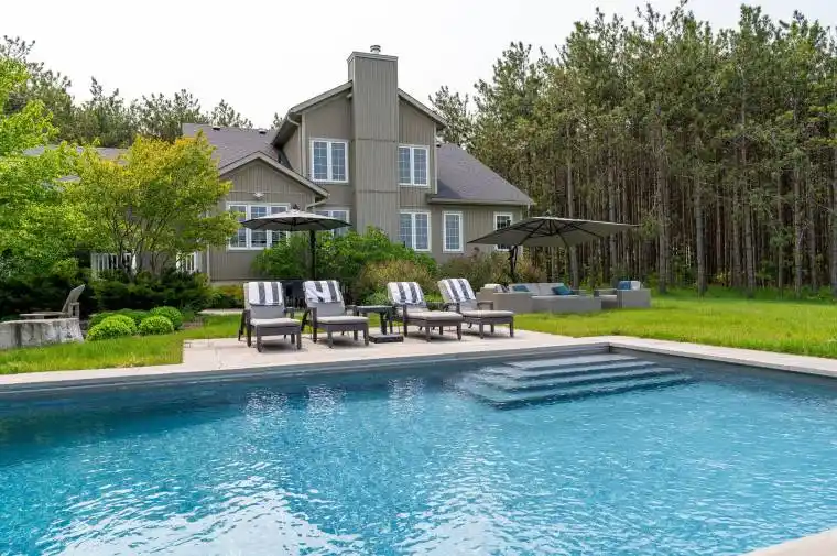 Hidden from the road by a stand of towering pines, this beautifully renovated 4-bedroom, 4-bathroom modern farmhouse sits on 5 private acres in the hills of Mulmur. Thoughtfully redesigned with a sophisticated aesthetic and professionally landscaped by the Landmark Group, the property offers exceptional outdoor living, including a newly built in-ground concrete saltwater pool (Todd’s Pools) with automatic cover, limestone patio, Trex decking, Rainmaker irrigation system, and sweeping views over rolling countryside and western sunsets.Inside, 2,800+ sq ft of finished living space showcases high-end finishes and a calming palette of whites, natural woods, and matte black accents. The Great Room features soaring cathedral ceilings, a reclaimed hemlock mantle, oversized windows, propane fireplace, and custom shiplap detail. The chef’s kitchen includes quartz countertops, soft-close cabinetry, a Kraus farmhouse sink, KitchenAid appliances, propane dual-fuel range, and designer lighting. A separate dining room and powder room complete the main level living space.The main-floor primary suite offers pastoral views and a spa-like 5-piece ensuite with heated floors, rainhead shower, and double quartz vanity. Upstairs, two guest bedrooms share a 5-piece bath. The finished lower level features extra-high ceilings, wood-burning fireplace with ledgestone surround, a stylish 4-piece bath, large bonus room for more beds, office nook, and laundry with new appliances.Additional features include Nest HVAC, Lutron LED lighting, solid core doors, Toto toilets, and exterior lighting on timers. Sleeping for 10. Outdoor enthusiasts will love the proximity to the Bruce Trail for hiking, Mansfield and Devils Glen ski clubs for winter sports, and Mad River Golf Clubjust 20 minutes away. Only 75 minutes from Toronto and 20 minutes to Creemore, this turnkey retreat blends modern comfort and natural beauty in one of Mulmur’s most coveted locations.