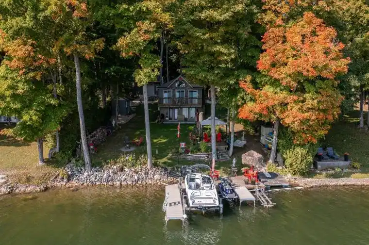Gorgeous waterfront views at this Lake Eugenia cottage/4 season home. This 3 bedroom, 2 bathroom fully renovated bungalow features an open concept living space on the main floor with views of the lake from the kitchen/dining island as well as the living room. Along with vaulted ceilings the living room has a propane Jotul fireplace and a walk-out to a balcony where you can further enjoy the lake view. Also featured on the main floor are 2 bedrooms and a 2pc bathroom/laundry room. In the basement you will find yourself with another view of the lake from the family room which has a propane fireplace and a walk-out to a concrete patio, a third bedroom and a 3pc bathroom, as well as the mechanical room. There is a 20×24 detached 2 door garage with a 9′ ceiling and metal roof, 2 storage sheds, and a deck over looking the waterside dock. The yard is beautifully landscaped and features an in-ground sprinkler system. Added bonus of shared ownership and use of 127 acres known as Macdonald Farm where there are trails for recreational use.