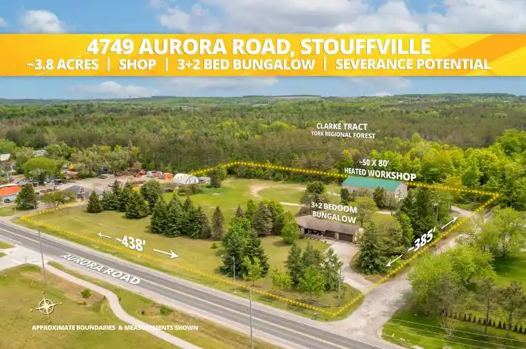 Welcome to 4749 Aurora RoadA Rare and Versatile Opportunity Nestled on Approximately 3.8 Acres With 438 Feet of Frontage Along Aurora Road and Approximately 385 Feet of Depth, Backing Onto the Tranquil York Regional Forest Clarke Tract. With Municipal Gas and Water Services and the Potential for up to Three Severed Lots, This Property Offers a Unique Chance for Development, Investment, or Multi-Use Living. The Property Features a ~50 X 80 Heated Metal Workshop Offering Approximately 4000 Square Feet of Floor Space, Ideal for Contractors, Landscapers, or Hobbyists. Designed for Functionality, It Features Two Oversized 14 X 12 Overhead Doors, Ample Overhead Storage, Water, and Gas Radiant Heating, Making It Suitable for Year-Round Use. Additionally a Well-Maintained 3+2 Bedroom Bungalow With an Attached 2-Car Garage. The Home Includes a Finished Lower-Level Suite With 2 Bedrooms, a Kitchen, Living Room, 3-Piece Bath, and Separate EntrancePerfect for Extended Family, Guests, or Rental Income.Ideally Located, 4749 Aurora Road Is Just Moments From the Schools, Shopping, Dining, and Recreational Amenities of Ballantrae and Surrounding Area. Backing Onto the York Regional Forest Clarke Tract, the Property Is Perfect for Outdoor Enthusiasts, With Easy Access to Biking, Hiking, and Jogging Trails!. For Commuters, This Property Offers Outstanding Convenience, Just Minutes From Highway 404, Auroras Big Box Retailers, and Go Train Access at Bloomington and Stouffville StationsBringing Everything Within Easy Reach.