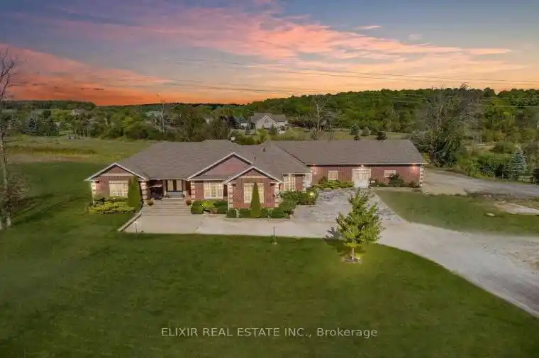 Two-in-One Opportunity: Residential and Business Potential. Discover the perfect blend of luxury living and business opportunity on this exceptional 3.22-acre property. This expansive bungalow features 9-ft ceilings on both the main floor and the walk-out lower level, creating an inviting atmosphere of space and sophistication. The grand foyer welcomes you with high ceilings and an open-concept layout, offering separate living and family rooms for ultimate functionality. The gourmet kitchen boasts stainless steel appliances, hardwood floors, and ample space for entertaining. The master suite is a serene retreat with a spa-like ensuite and countryside views. Three additional bedrooms with large closets and oversized windows flood the interiors with natural light. The finished walk-out basement includes 4 bedrooms, 2 kitchens, and multiple living areas, making it ideal for rental income or multi-generational living. A 3-car garage complements the home, while an impressive 2,800 sq. ft. addition operates as a thriving party hall, perfect for continuing as an event venue or repurposing to meet your unique needs. Outside, the 3.22 acres of flat land offer incredible potential for future development, while a covered garage area adds further flexibility.