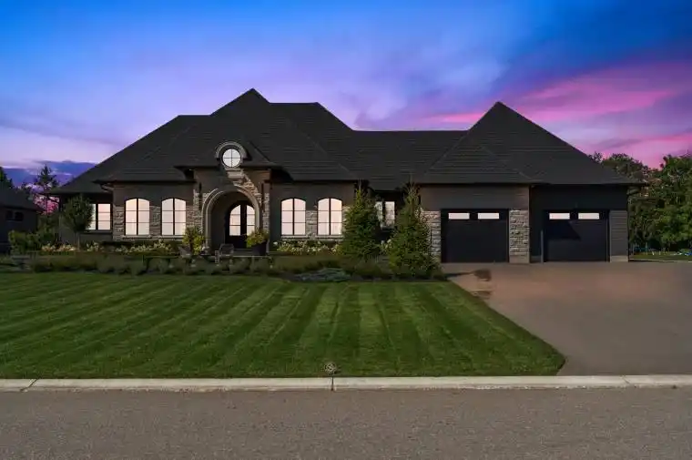 Welcome to 11 August, a refined blend of elegance, comfort, and thoughtful design nestled in one of the areas most sought-after communities. This exceptional bungalow is a true retreat where architectural sophistication and curated landscaping create an inviting sanctuary you’ll be proud to call home. Step inside and be captivated by the grand living room, where vaulted ceilings and a dramatic wall of windows flood the space with natural light and frame breathtaking views of the lush, ever-changing scenery. Striking black and white contrasts throughout the home lend an air of contemporary sophistication, with the living rooms sleek fireplace serving as a bold yet cozy centerpiece. At the heart of the home is a sun-drenched double island kitchen a dream for both everyday living and entertaining. Abundant windows invite the outdoors in, making every culinary moment feel inspiring and connected to nature. The primary suite is a serene escape, featuring a spa-inspired ensuite with a freestanding tub, dual-head walk-in shower, and elegant modern finishes. The fully finished lower level expands your lifestyle possibilities with a dedicated media zone, an additional bedroom for guests, and a beautifully outfitted home gym complete with glass double doors and a full bath for post-workout convenience. For hobbyists and outdoor enthusiasts, the property boasts a massive detached garage in addition to the double attached garage. With front and rear overhead doors, its perfectly equipped to house your vehicles, recreational gear, and workshop needs. Step outside to your covered back patio, complete with a vaulted ceiling and pot lighting perfect for morning coffee or hosting unforgettable evenings under the stars.