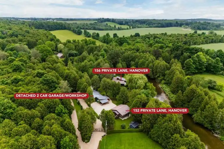 Exceptional property with two homes and a detached garage nestled on 379 feet along the Saugeen River. A rare and wonderful opportunity to embrace the lifestyle you’ve always dreamed of. This immaculate, nearly one-acre private estate offers a unique chance for families to live together yet separately. From the moment you arrive, a set of stately iron gates welcomes you, offering both privacy and security. Behind them, lush green lawns, mature gardens, a variety of trees, including a selection of fruit-bearing trees create a peaceful natural setting perfect for outdoor living and family gatherings. Your days can be filled with swimming, canoeing, or kayaking, fishing, or drifting downstream on a tube in the clean fresh water with its soft sandy bottom. Whether you’re hosting friends on the spacious decks or enjoying a quiet morning coffee while watching the river flow, every moment here is designed to nourish your soul. The main residence offers just under 1400 square feet of living space featuring a spacious layout, a large kitchen ideal for family meals, two comfortable bedrooms, and a generous deck for entertaining or relaxing under the stars. The second home offers nearly 700 square feet of living space with two large bedrooms, a full bathroom with a Cinderella toilet, a bright and open living area, kitchen with stone counter tops and a beautiful back porch with sweeping views of the river–an ideal retreat for guests, extended family, or even a rental opportunity. A detached garage and workshop provide ample space to store all your tools and toys, and all structures–including both homes and the shop–are finished with durable metal roofing for peace of mind and low maintenance. This is more than just a property–it’s a multi-family compound, a private riverside sanctuary, and a lifestyle destination. Rarely does a place like this come available. Don’t miss your chance to live the dream.