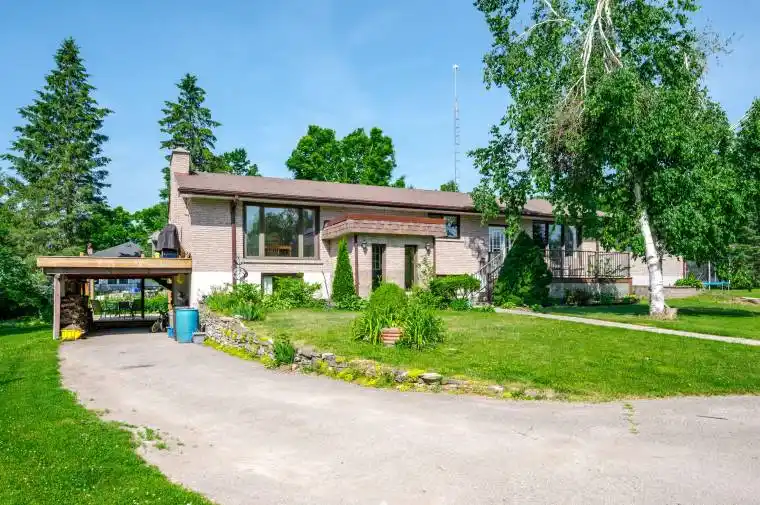 Outstanding property with over 2 acres of privacy close to Peterborough. Includes approximately 1900 sq.ft. bungalow with attached garage, detached garage/shop and grounds that show like a park. Home is finished on both levels with 3 bedrooms on main level and 4th bedroom down. Two entrances from front of house, includes off of front porch into living room and another into a mudroom for those wet or snowy days. Kitchen is open concept with dining area, hardwood floors, granite and quartz countertops with a walkout to large deck over garage. Large primary bedroom with spectacular 4pc ensuite. The finished basement has a walkout to the garage and from there out to the backyard and patio. There is a very large area beside house that maximizes privacy and could be used for recreation or installation of a pool. The shop has a 14 foot overhead door, large compressor, has its own well, heated by oil but needs an updated oil tank, high clear ceiling height with mezzanine. Absolutely perfect setup for a trades man, car person or area to store and work on your toys! The large living room was once an indoor pool area that has been closed in with engineered floor joist and covering (could be converted back). This is a rare find located just minutes from town.