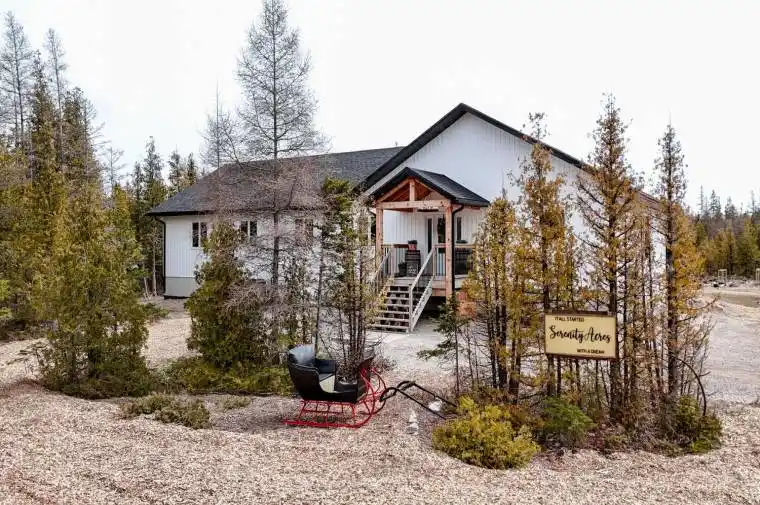 Welcome to your dream retreat on the stunning Bruce Peninsula. Tucked away on 5 private acres with scenic walking trails, this custom-built 2021 modern farmhouse blends rustic warmth with contemporary elegance. With 5 spacious bedrooms and 2.5 baths, the open-concept layout is bright and airy with vaulted ceilings and premium finishes throughout. The heart of the home is a beautifully crafted chefs dream kitchen featuring a huge 8 burner double oven propane gas range, Canadian-made cabinetry, a butler’s pantry, and locally milled, live-edge wood shelving and bar….perfect for hosting or gathering with family. Throughout the home, handcrafted touches shine: local wood trim, beams, and solid doors, along with curated Canadian-made furnishings. The serene primary suite is a true retreat with a luxurious 4-piece ensuite, soaker tub, and walk-in closet. A spacious laundry/office combo with walkout leads to a large covered back deck and clothesline for practical country living. Step outside to enjoy raised garden beds, chicken coops, and peaceful views of your own private acreage.Quonset hut for parking or storage. Just minutes from Lake Hurons crystal-clear waters, with Whiskey Harbour and Pike Bay nearby for beach days and unforgettable sunsets. Conveniently located approx. 20 mins to Wiarton, 15 mins to Lions Head, and 45 mins to Tobermory, you’ll enjoy both privacy and access.So whether you’re seeking a full-time home, vacation getaway, or artisan retreat, this one-of-a-kind property offers comfort, character, and a deep connection to nature.