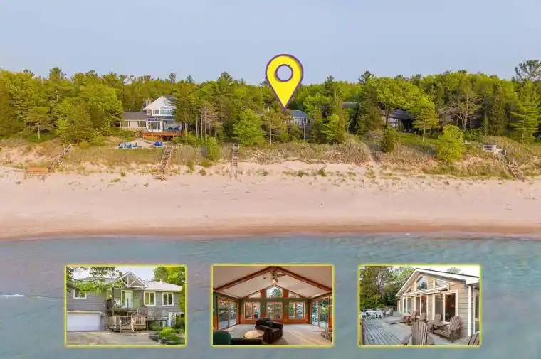 GRAND BEND PREMIUM LAKEFRONT IN THE MOST SOUGHT AFTER & EXCLUSIVE PRIVATE BEACH COMMUNITY IN LAKE HURON | 108 FT OF PRIVATELY OWNED BEACH FRONTAGE | BEACH O’ PINES GATED SUBDIVISION BORDERING THE LONGEST CONTINUOUS SANDY BEACH WALK IN THE GREAT LAKES | ROCK SOLID 4 SEASON CUSTOM BEACH HOUSE! Come take a walk through paradise along an 11+ KM stretch of pure golden sand & experience true waterfront magic down the Pinery Park’s undeveloped shoreline. This location is truly priceless. This location is the one & only Beach O’ Pines private beach community at the edge of the Pinery! For lakefront in Lake Huron, this is as good as it gets! In Beach O’ Pines, you can keep your boat or jet skis right on your privately owned beach in front of this 4+1 bedroom 3 full bathroom custom home offering nearly 3200 SQ FT of finished living space w/ lots of additional room for storage + an oversized 2.5 car insulated garage. You can see those sparkling Huron waters from the minute you walk through the main door & into the open-concept vaulted & beamed great room w/ wall to wall windows & a field stone fireplace. The bright & spacious main level is in great shape w/ a very generous kitchen, oversized dining area for entertaining & large family gatherings, a superb lakefront master suite w/ ensuite bath + 2 more generous bedrooms, a 2nd main level full bath, & main level laundry. The home is ready for full time family enjoyment on Day 1, but for buyers considering a few updates, this extremely well-built house provides an excellent template! Even the walk-out lower level will surprise you, w/ large principal rooms including another bedroom, a potential 5th bedroom or guest suite, a 3rd full bath, & workshop space that connects to the oversized garage. The lot itself is worth well in excess of $3 mil w/o the house offering over 3/4 of an acre of pure lakefront bliss, but the quality of this home, as-is, w/ updated roof & decks, 400 AMP electrical, etc. truly completes the package!