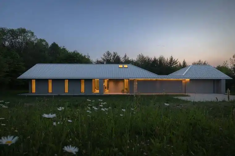Welcome to Ridge House, a stunning blend of minimalist architecture and modern living, set on 25 acres of pristine land in the tranquil hamlet of Ravenna. Designed to the exacting Passive House Standards by the renowned firm Superkul and built by John W. Gordon Custom Builders, this home seamlessly integrates with its natural surroundings of towering evergreens and peaceful woods. Nestled just below the property’s highest ridge, Ridge House emerges naturally from the landscape, creating a sense of calm and seclusion. As you approach, the driveway disappears into the forest, and the distinctive roofline, floating among the trees, captures the eye. This thoughtful and intentional design makes Ridge House both visually striking and highly functional, a serene retreat where every detail enhances a connection to nature. Inside, the clean, open-concept layout highlights a relaxed, uncomplicated lifestyle. Natural light floods the living and dining areas, which flow effortlessly into the outdoors, blurring the lines between interior and exterior spaces. A dedicated office offers a peaceful work or relaxation space, while the spa-like bathroom, complete with a soaking tub that opens to a zen garden, provides a luxurious retreat. The single-level floor plan enhances the home’s minimalist ethos, eliminating stairs for a smooth, fluid living experience. The primary bedroom, positioned at one end of the house, offers a private sanctuary, while guest rooms on the opposite side ensure privacy and comfort. A chef’s kitchen, which blends functionality with beauty, anchors the space. A two-way STUV fireplace adds warmth and elegance, serving as a centerpiece that connects indoor and outdoor spaces. Ridge House isn’t just a home; it’s an invitation to experience a harmonious blend of modern design and natural beauty, where simplicity and sophistication meet.