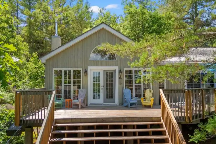 Welcome to your private waterfront escape on stunning Go Home Lake. With 160 feet of shoreline, two large docks, and incredible views over Paradise Bay, this beautifully renovated cottage offers the perfect blend of comfort, style, and adventure. Just a 10-minute boat ride from the marina, the property includes a spacious main cottage with a large addition, soaring vaulted ceilings, and high-end finishes throughout. The open-concept living room features a striking stone fireplace and walkout to a massive deck overlooking the water ideal for relaxing or entertaining. A custom gourmet kitchen with stainless steel appliances flows into the dining room, making hosting a breeze. The primary bedroom includes vaulted ceilings, water views, and direct deck access. Down by the water, there is a dock shed that sits right on the deck to store all of your lakeside lounging gear and water toys. An electric luggage carrier makes bringing supplies up the hill effortless. Out back, you’ll find a shed and a separate art/craft studio for creative pursuits. A spacious bunkie provides extra room for family or guests with vaulted ceilings, two bedrooms, a living area, kitchenette, and its own deck. Whether you’re soaking in the views, swimming off the dock, or enjoying cozy nights by the fire, this is lakeside living at its best. Accessed by boat only.