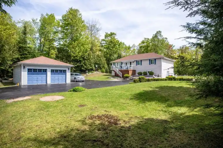 Beautifully Updated 3-Bedroom Home with Bonus Spaces in Oliphant. Welcome to this lovingly maintained and beautifully landscaped 3-bedroom, 1.5-bath home, ideally located in the peaceful lakeside community of Oliphant. Perfect as a year-round residence or seasonal retreat, this property offers the perfect mix of comfort, functionality, and outdoor enjoyment just minutes from the shores of Lake Huron. From the moment you arrive, you’ll notice the paved driveway leading to a detached two-car garage, complemented by two additional outbuildings perfect for storage, hobbies, or workshop space. Enjoy morning coffee on the front deck and unwind on the spacious back deck, both surrounded by mature trees and thoughtfully designed gardens. Inside, the home features a bright and welcoming interior with tile floors throughout the main living areas. The kitchen is equipped with a gas stove and newer appliances, making meal prep a breeze. The open-concept layout flows easily into the dining and living areas, where the cozy atmosphere makes you feel right at home. All three bedrooms are generously sized, offering plenty of space for family or guests. The main bathroom includes a convenient walk-in shower, and there’s an additional half bath for added comfort. The walk-out lower level adds significant living space with a large rec room ideal for entertaining or relaxing and a versatile bonus room that can serve as a home office, guest room, or extra storage space. For added convenience after a day at the beach or gardening, an outdoor shower is tucked around the back. Comfort is ensured year-round with central air conditioning and a propane furnace. Ideally located on a quiet street and just a short drive to Wiarton, Sauble Beach, and a variety of outdoor recreation options including boating, fishing, and hiking, this move-in ready home in Oliphant is the perfect place to create lasting memories.