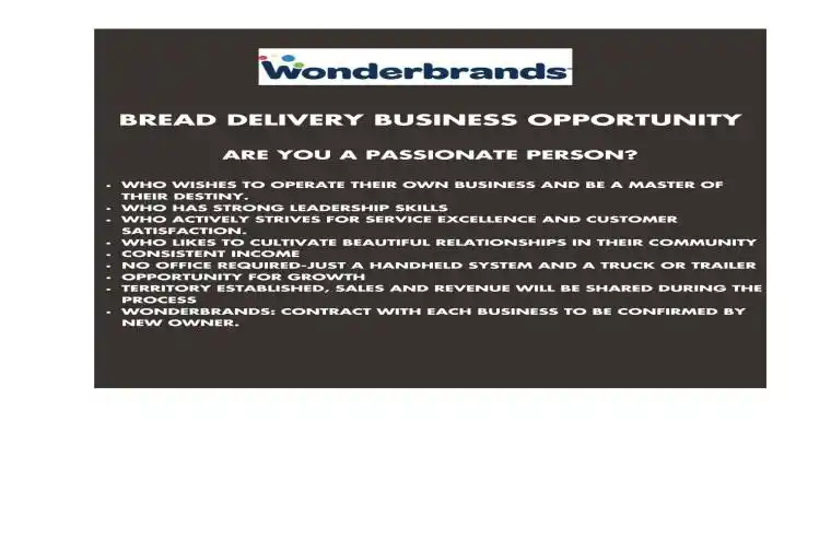 Unique opportunity to run your own business. Established client base already in place. Room to expand with more customers. Bread delivery business in a set territory. Wonderbrand is a very well known product. No office required, no rental space just pick up the product and deliver to your clients. Call for more information.