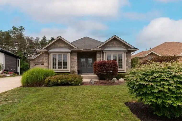 Backing directly onto the 11th hole of the Meaford Golf & Country Club, this all-stone bungalow offers sweeping views of the fairway and tranquil pond and unlike alot of other homes for sale on the course, this one is freehold with no monthly condo fees. Built in 2006 by respected builder Tom Clancy, its one of the best values in the area for golf course living.Nestled on a quiet cul-de-sac among other prestigious homes, youre just minutes to the marina and a short drive to Blue Mountain. The full stone exterior, symmetrical gabled rooflines, twin bay windows, and impressive front entry create timeless curb appeal. A concrete driveway leads to the oversized double garage, with plenty of parking for guests.Inside, natural light floods the space, highlighting the upscale finishes and craftsmanship. Hardwood floors run throughout the main level, while soaring ceilings create an airy, grand feel. The formal dining room features a tiered tray ceiling with pot lights, and the kitchen boasts rich wood cabinetry, a breakfast bar, and an open flow into the spacious living room with a gas fireplace and a wall of windows framing the golf course view. Step onto the elevated deck with glass railings and soak in the peaceful vista of the pond and manicured greens.The primary suite is generously sized with spectacular backyard views, a walk-in closet, and a spa-like ensuite with tiled glass shower, double vanity, and jacuzzi tub. A second bedroom or office, main floor laundry, add convenience.The finished lower level includes a rec room with walkout to the backyard, a third bedroom, 3-pc bath, and plenty of room to expand.If youve been dreaming of golf course living without the condo fees, this rare freehold property combines beauty, value, and an unbeatable lifestyle.