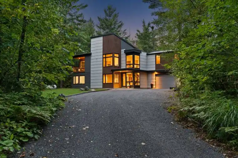 Welcome to Saddlebrook Estates, where modern sophistication meets rural tranquillity in this awardwinning, Brian Saumure-designed and Maple Leaf Custom Homesbuilt residence (2014). Nestled on a private, treed 3.33acre lot backing onto 500+ acres of Crown land with resident maintained hiking, snowshoeing, and cross country ski trails and guaranteed unobstructed views this reverse concept home offers 2,775sqft of refined living space (1,650sqft main level; 1,125sqft lower level) plus a 175sqft, three walled covered outdoor entertaining area. Inside, radiant in-floor heating warms the lower level with an architectural steel and glass staircase leading to soaring sloped ceilings on the upper level, and abundant interior and exterior lighting creates an open, airy ambiance. The great room, anchored by a Napoleon fireplace with built-in speakers, flows seamlessly into a chef’s kitchen featuring Elite appliances, a walk-in pantry, electronic pushbutton cupboards, a dining area, and a powder room roughed in for a future bath or shower. Upstairs, the primary suite boasts a dressing area and spa-style ensuite, and the bright office opens to a private balcony and upper level yard walkout. The lower level includes a media room, three additional bedrooms, a full bath, mudroom, storage/gym area, mechanical room, and direct access to the full two car garage. Built for style and durability, the exterior combines cedar accents with concrete board siding and metal cladding. Mechanical systems include a 2019 furnace, water conditioner, on-demand boiler, 200amp electrical service, and a 500gal propane tank, with average hydro costs of $140/month. Tucked at the end of a quiet cul-de-sac just minutes to Carp Village and central Kanata, this is a rare opportunity to enjoy upscale, efficient living surrounded by nature.