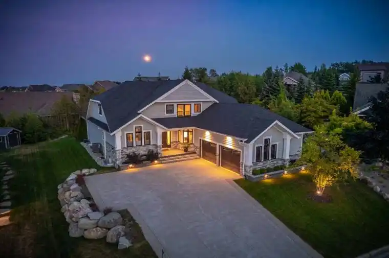 Tucked away on a quiet cul de sac in the prestigious Lora Bay community, this exceptional residence, built by Reids Heritage Homes in 2019, pairs elegant design with thoughtful upgrades and resort-style outdoor living. Backing onto mature trees, the home offers rare privacy and tranquility just minutes from Georgian Bay, golf, skiing, and the shops and restaurants of Thornbury.A covered front porch opens into a refined foyer with updated tile (2025), setting the tone for the elevated finishes throughout. A custom home office with built-in cabinetry and millwork (2022) sits just off the entry, while the newly renovated powder room (2025) adds a modern touch for guests.The great room is the heart of the home, with soaring ceilings, a gas fireplace, and oversized windows overlooking the manicured backyard. The chefs kitchen features quartz counters, high-end appliances, a walk-in pantry, and a butlers pantry connecting to the mudroom, laundry, and two-car garage.The main-floor primary suite offers serene garden views, a walk-in closet, and a spa-like ensuite with double vanities, a soaking tub, and glass shower.Step outside to your private oasis: a covered deck for dining and lounging, lush gardens, a built-in hot tub, and a heated saltwater pool installed in 2020 by Clear Choice. This showstopping outdoor space was awarded second place in the 2021 North American Inground Pool Design Awards.Upstairs, a versatile loft-style family room, two spacious guest suites, and a five-piece bath provide comfort and space.The fully finished basement includes a large recreation room with a gas fireplace, custom wet bar, built-ins, a guest bedroom, four-piece bath, home gym or optional fifth bedroom, and ample storage.Residents of Lora Bay enjoy a vibrant community with access to a championship golf course, scenic walking trails, and Georgian Bay just moments away.