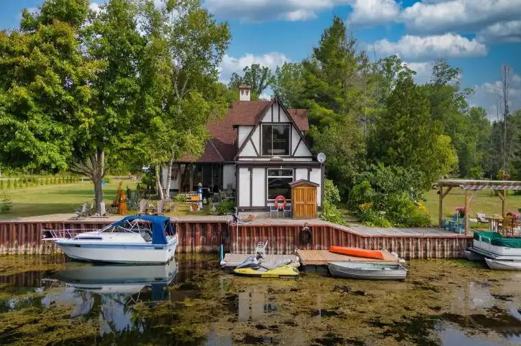 Unlimited Possibilities! Waterfront property on Georgian Bay with access to all the Great Lakes, the Atlantic Ocean, and beyond! This 2000 sq ft Tudor home meets so many needs with its sheltered dockage. This fully finished home features 3 large bedrooms, one ideal as a separate in-law suite, and a large detached garage with potential for an accessory dwelling unit for additional rental space or living quarters. A Bunkie-style fully powered office area is also on the property. Ample parking and 75 feet of waterfront make this home a must-see to fully appreciate its unique features.
