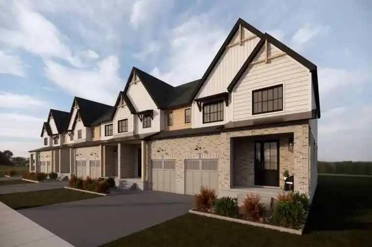 THE HOMESTEAD a lovely 1676sq ft interior townhome designed for efficiency and functionality at an affordable entry level price point. A thoughtfully laid out open concept living area that combines the living room, dining space, and kitchen all with 9′ ceilings. The kitchen is well designed with additional storage and counter space at the island with oversized stone counter tops. A modest dining area overlooks the rear yard and open right into the main living room for a bright airy space. Ascending to the second floor, you’ll find the comfortable primary bedroom with walk in closet and private ensuite featuring a fully tiled shower with glass door. The two additional bedrooms are designed with simplicity and functionality in mind for kids or work from home spaces. A convenient second level laundry room is a modern day convenience you will appreciate in your day to day life. The basement remains a blank slate for your future design but does come complete with a 2pc bathroom rough in. This Finoro Homes floor plan encompasses coziness and practicality, making the most out of every square foot without compromising on comfort or style. The exterior finishing touches include a paved driveway, landscaping package and beautiful farmhouse features such as the wide natural wood post. Ask for a full list of incredible features and inclusions! Move in 2026 but take advantage of 2025 pricing while you can! ** Photos and floor plans are artist concepts only and may not be exactly as shown.