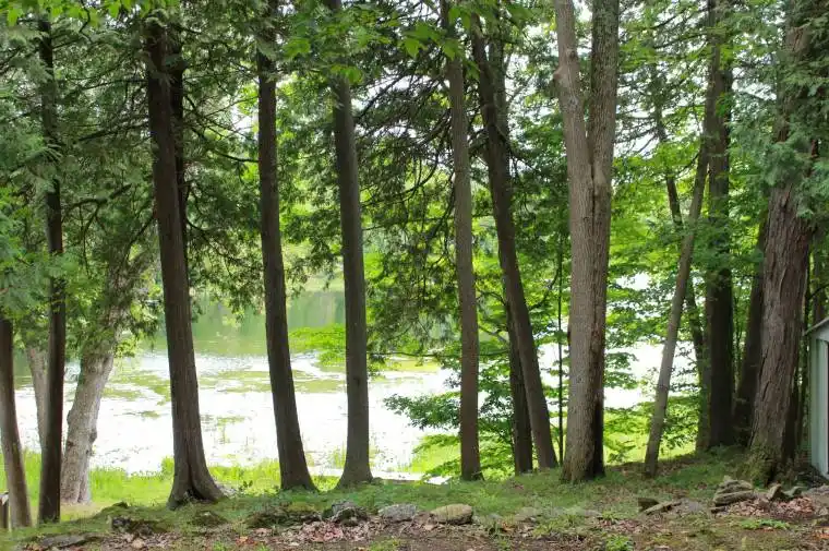 This waterfront property offers natural beauty nestled along the shoreline of Silver Lake. It provides stunning water views year-round and direct access for boating and swimming. Mature trees create a park-like setting. There appears to be part of an old foundation.