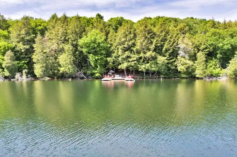 Explore the opportunity to design and build a private oasis on serene Bella Lake! This 2.15-acre waterfront lot boasts 270 feet of shoreline, providing unparalleled privacy from neighbouring properties and access to Rebecca Lake for added recreation. Site approval for a 20m setback was obtained by the current owners. The lot features a newer, recently installed permitted dock, making it easy to access the water for all your recreational activities. The entry to the lake is sandy and the depth is approximately 12′ off the end of the dock. The partially cleared area includes a cute newer bunkie and outhouse, providing convenience for weekend getaways or temporary stays. The terraced and sloped terrain of the lot allows for stunning views of the lake; a picturesque setting for your new home or cottage. Hydro is available at the lot line. Located just minutes to Limberlost Forest and Wildlife Reserve for endless exploration and an easy drive to downtown Huntsville. Any interested parties should confirm with the township that they are able to construct what they desire to build.