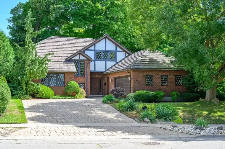 Welcome to 33 Walnut Drive, a timeless Tudor-style residence, custom designed & built in 1984 for the original family who has lovingly maintained it ever since. Offering over 4,800 sq ft of thoughtfully designed interior space, this home is a true blend of character, craftsmanship, & comfort. Every detail has been carefully curated to exceed expectations. From the moment you arrive, the curb appeal is undeniable – a stone walkway, mature trees, & professionally landscaped gardens create a picture-perfect first impression. Step inside to a gracious entry way & grand two-story living room featuring soaring ceilings, striking fireplace, & views of the enchanting backyard. The dining room offers serene vistas of a cascading waterfall & includes a walkout to the private oasis with lush gardens & an expansive deck, ideal for entertaining or peaceful mornings with coffee. The chefs kitchen includes a generous eat-in area & opens to the family room, creating a warm, inviting space for gatherings. The main-floor primary suite is a private retreat, complete with walk-in closet & luxurious ensuite. Also on the main level is an executive office featuring custom millwork & built-in shelving, ideal for working from home. Upstairs, you’ll find 3 additional spacious bedrooms, full bath, & a bright open loft, ideal as a secondary office, studio, or playroom. The lower level offers a large recreation space ready to be customized into a games room, home theatre, or gym. There is ample storage throughout. Additional features include double garage with inside access, main floor laundry, steel roof, 200 AMP service, new furnace & A/C. Ideally situated in an established neighbourhood, walkable to shops & top notch schools. Floor plans & construction specifications, which exceeded standard building codes, are available upon request. Offered for the first time, this home has been the setting for a lifetime of memories. Now, it’s ready for you to begin your own chapter.