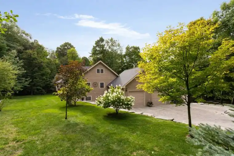 Welcome to 26 Eleventh St in Midland, situated in an incredible park-like setting with your own pond, surrounded by mature trees on over 2 acres. Minutes from historic shops and dining in downtown Midland, from the shore of Georgian Bay, and an abundance of all season trails for the nature enthusiasts. This residence offers architectural flare and unique finishes throughout – warmth of natural wood details, natural light via upgraded window package – attention to form and design at every turn. Large family? Home business? Extended family? Frequent guests? There is no shortage of functional living space with 6 bedrooms, 4 bathrooms, 2 kitchens, 2 laundry rooms, loft space above garage, above grade lower level, multiple entrances and an abundance of garage space and parking. Open concept floor plan – kitchen, living room, dining room. Custom kitchen features granite countertops, cooktop, double wall oven, food steamer, s/s appliances. Dining room large enough for hosting festive meals. Great room with soaring 15′ tongue/groove ceilings, feature wall with gas fireplace and stone mantle. Main level walk out to beautiful deck, privacy offered by the mature tree canopy. Convenience of primary bedroom on the main level with stunning renovated 5pc ensuite – glass walled shower, double sink vanity, quartz countertop, heated floor. Look up – incredible loft space provides additional living room, bedrooms, bathroom – complete with upper level balcony. Full finished lower level (new lighting) with walk out/separate entrance – bedrooms, kitchen, laundry, rec room – set up perfectly for multigenerational family or guests looking for some private space. Above grade windows bathe this additional living space with natural light. Gather around the gas fireplace to warm up on cool evenings. Step outdoors to appreciate FIVE garage bays, an abundance of parking for cars, work vehicles, RVs and more. Additional 1 acre of beautiful, mature, forested property is included!