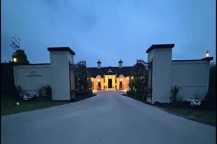 Welcome to 4252 Burnside Line Gated custom-built bungalow on 1.92 acres backing onto Hawk Ridge Golf Course. 4500 sf with radiant in-floor heating, including a fully insulated 1,000 sf three-car garage with two drive-through bays. 800 sf covered porch. Features a 5x12island, Jenn-Air appliances (steam oven, warming drawer), and a 72 Napoleon gas fireplace. 12 ceilings in the main room (10 elsewhere and 8 white oak interior doors with acid-washed qlass. Floor-to-ceiling picture windows fill the home with natural light. Three spacious bedrooms, each with ensuite. Artesian well, starry countryside views, yet only 1 km from town amenities. Symmetrical design with timeless appeal.