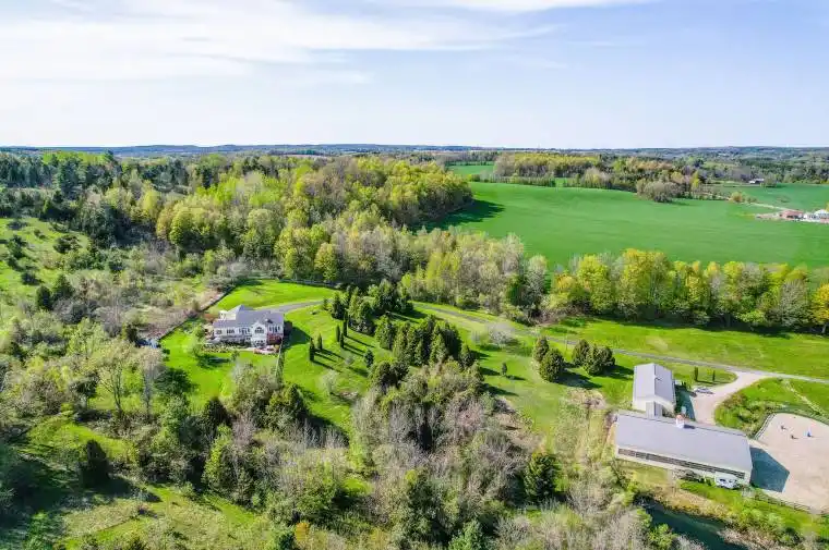 Nestled on 40 stunning acres in a prime location just moments from the 401, this exceptional equestrian estate offers a tranquil country escape. For the equestrian enthusiast, the property features impressive facilities, including a modern 8-stall barn with tack, feed, and storage rooms that open into a bright, 6000 sq ft indoor riding arena. The picturesque lower acreage encompasses 7 paddocks and a bass-filled pond. A custom-built residence commands panoramic vistas of the rolling Northumberland Hills from every window. Inside, discover grand principal rooms thoughtfully designed for effortless single-level living and sophisticated entertaining. The great room features vaulted ceilings, anchored by a magnificent stone fireplace. The gourmet kitchen flows seamlessly into a spacious family dining area. Retreat to the generous main-floor primary suite, complete with a walk-in closet, ensuite, and a private balcony perfect for capturing the sunrise. A welcoming den with a fireplace and a sun-drenched sunroom completes the main floor. The beautifully finished lower level provides ample space for family and guests including a home gym. A charming 4-bed bunkie offers additional versatile space. Multiple walkouts lead to landscaped perennial gardens and the estate’s natural beauty. Explore private woodland trails to enjoy or simply immerse yourself in the peaceful ambiance of open pastures. This is not just a home; it’s an invitation to embrace a legacy lifestyle.