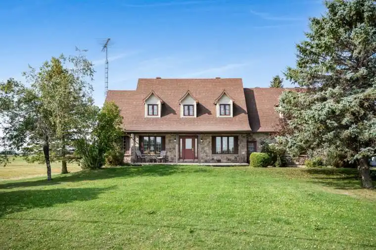 Welcome to this charming 4+1 bedroom 2 storey home set on over 1 acre of private countryside in the heart of The Nation. With its stately Iroquoise stone façade and expansive driveway leading to a double attached garage this property exudes warmth and curb appeal. Inside a grand foyer with wood accents and a sweeping staircase sets the tone. The main level offers a spacious living room highlighted by a propane fireplace with wood mantel and hardwood floors. A bright dining area flows into the well appointed kitchen with wood cabinetry stainless steel appliances and a centre island ideal for both everyday living and entertaining. Patio doors lead to a large deck overlooking open fields perfect for gatherings or enjoying peaceful sunsets. Upstairs discover three generously sized bedrooms including a primary suite with a 5 piece ensuite bathroom. Additional rooms provide excellent flexibility for guests a home office or personal projects. The finished basement adds versatility with a cozy lounge area recreation space complete with a bar and pool table an extra bedroom and abundant storage. Outdoors enjoy the serenity of wide open country views with plenty of space for gardening hobbies or future projects. The detached garage or workshop and expansive driveway add convenience and functionality. Blending timeless character with comfort this property is a peaceful retreat offering space charm and tranquility in a rural setting.
