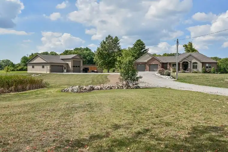 Beautiful 4ac rural package 15 mins SW of Cayuga near Grand River -45 min/Hamilton -surrounded by fields & forests providing paradise setting for 2016 blt one owner home introducing 1749sf living area, 2064sf basement, 1013sf garage, 2100sf det. insulated Toy Shop blt in 2019 with 10+16 ceilings, 14×16 & 10×16 roll up doors, conc. flooring & 200 hydro + 8×40 storage container. Ftrs open conc. kitchen sporting granite counters, island & SS appliances, dining room w/sliding door WO to covered porch, great room incs vaulted ceilings & stone p/g FP, primary bedroom ftrs jacuzzi en-suite & WI closet, 2 bedrooms, 4 pc bath, 2pc bath & MF laundry. Lower level incs ins. vapour barrier walls & RI bath w/sewage pump, 2 cold rooms & utility/pump room. Extras-p/gas/wood hi-eff combination furnace, AC, HRV, 4800g cistern, UV & security cameras.