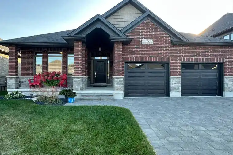 Welcome to Prestigious South Grove Meadows 19 Statham Street, a stunning Dwyer-built all-brick home tucked away on a quiet inside street with minimal traffic, just minutes from Caradoc Sands Golf Club. Sitting on a generous 130 ft lot, this 2+2 bedroom, 3 full bath property showcases thoughtful upgrades, timeless finishes, and a warm open-concept design. Step inside to find a bright, airy main floor with added windows for natural light, a cozy living room fireplace, and a gourmet kitchen featuring granite countertops, stainless steel appliances, a large island, walk-in corner pantry, and sleek black sink. The primary suite offers a walk-in closet and private ensuite, while the second main-floor bedroom is ideal for guests or a home office. The fully finished lower level includes 2 additional bedrooms (one with walk-in closet), a full bathroom with heated floors, a spacious family room with a gas fireplace, and soundproofing upgrades for ultimate comfort. Outside, enjoy a 7ft fenced backyard, stamped poured concrete patio, extended covered porch, perfect for entertaining or relaxing in your private retreat. The homes exterior is designed for low maintenance with aluminum-wrapped posts, stone skirt with brick accents, and upgraded black garage doors.Additional features include: Double car garage, central vac, CAT-6 wiring in every room, window coverings (Levolor blinds upstairs, blackout blinds downstairs), Quartz countertops in all upstairs baths, Noise insulation upgrades between levels. On demand tankless water heater. This move-in ready home is close to schools, parks, shopping, dining, and recreational facilities making it an exceptional choice for modern living in Strathroy.