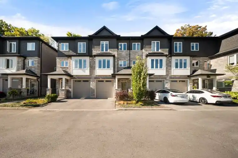 Welcome to this stunning and spacious 3-bedroom, 4-bathroom executive townhome, ideally situated in the heart of desirable Ancaster Village. Nestled in an exclusive 10-unit complex backing onto a private ravine, this meticulously maintained residence offers 2,000+ sq. ft. of beautifully designed living space with exceptional upgrades throughout. Step inside from the charming covered porch into a versatile flex space with direct access to the garage and a walkout to an exposed aggregate patio. A convenient 2-piece bath with quartz vanity completes this level extending your living space ideal for a home office, recreation room, guest suite or even a 4th bedroom. The main level is designed for modern living and entertaining, featuring soaring 9-ft ceilings, crown moulding, hardwood floors, and pot lighting. A striking gas fireplace anchors the open-concept living room, with double doors leading to a deck overlooking the ravine perfect for barbecuing. The bright dining area and crisp white kitchen boast quartz counters, a breakfast peninsula, gorgeous hexagon backsplash, stainless steel appliances, and ample cabinetry. Upstairs, the primary bedroom offers a walk-in closet and upgraded ensuite with a glass walk-in shower and ravine views. Two additional bedrooms, a full 4-piece bath with quartz vanity, and convenient upper-level laundry provide comfort and functionality. Located just steps from amenities, coffee shops, dining, bakeries, trails, schools, and boutique shopping, this move-in ready home combines luxury, convenience, and a serene natural setting. A rare opportunity to own a premium Ancaster townhome! BONUS: 1 year maintenance fees prepaid by seller at time of closing.