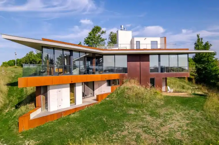 The Brillinger House. Architecture and nature harmonize in a magical setting with this stunning 2024 build, designed by Adam Thom. The structure brings the hills, forest, field and light into this contemporary home. The landscape is intended to stay as natural as possible, the terrain just mildly tamed. One is welcomed through a unique entrance, with shelter and open sky. No disappointment upon entering. The open concept living area invites you in, a magnificent expanse of doors, windows reaching from the floor to the soaring ceiling mirror natures earth to sky magic. Slate floors, wood textured concrete and warm teak walls all work in balance with the vistas. This main level is graced with The Great Room and fireplace, a subtle minimalist bar kitchen, massive deck, two bedrooms, and a sublime bathroom with a walk-in shower & separate 2nd 2 pc. One can also ascend a staircase to a sunlit quiet reading or meditating area that leads to a deck with 360 views of the countryside. Use the elevator or the grand open staircase to the ground level where a den/office space, with doors open to the glorious countryside. A grand master bedroom with a walkout stands as another opportunity to let nature in. Separate from the water closet, an open shower area leads to an open deck, outdoor shower and sauna. A 2nd potential kitchen, laundry are next to the room holding the state of the art heating and cooling system. Two homes sit on this, private, secluded 63 acres property, 5 min north of St. Anne’s Spa in Grafton. The 2nd home, also included, Petit Brillinger, perfect as a guest home or rental, while a totally different design concept, offer 3 bedrooms, 2 baths and a warm open concept living, dining, kitchen. Offering the same private views and surroundings, each unseen by the other. Paths circle the property and take you to a natural spring fed pond, perfect for swimming, skating and picnics or a summer cocktails. This is your perfect retreat.