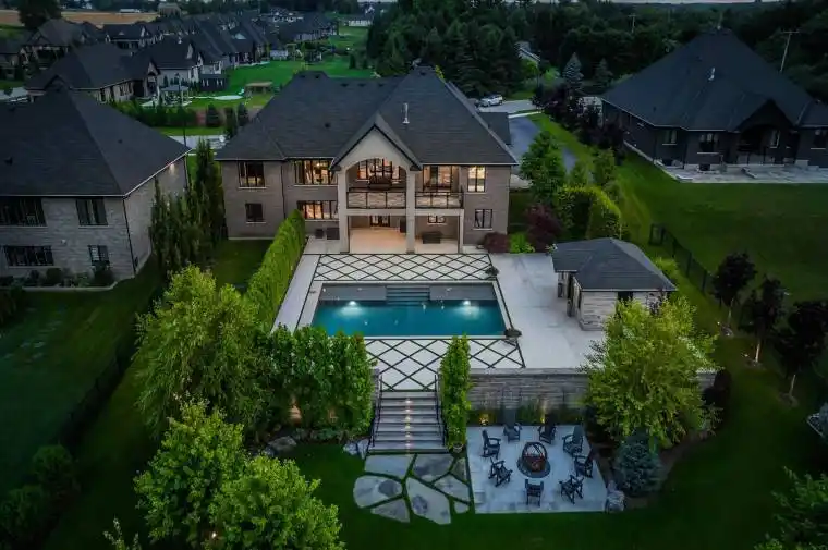 Nestled on a pristine 3/4 acre lot in the coveted Swan Creek Estates community, this exquisite all-stone bungalow redefines luxury living. With over 5,000 sq ft of masterfully crafted space, every detail of this ENERGY STAR certified residence speaks to sophistication and comfort. From the moment you enter through handcrafted Canadian mahogany doors, you’re enveloped in architectural grandeur vaulted ceilings, 8′ doors, and expansive windows that bathe the interiors in natural light. The open-concept design flows seamlessly through curated living spaces, featuring custom millwork, a sleek linear fireplace, and heated polished concrete floors on the lower level. The gourmet kitchen is a culinary showpiece, complete with integrated high-end appliances, bespoke cabinetry, a generous prep island, and a butlers pantry designed for effortless entertaining. Five bedrooms and four spa-inspired bathrooms including a serene primary ensuite with in-floor heating offer a retreat-like ambiance throughout. Step outside to discover a private oasis. The resort-style grounds showcase award-winning landscaping, a custom year-round pool with tanning ledges and ambient lighting, a charming Muskoka playset, and a built-in fire pit perfect for twilight gatherings. A cedar-lined pool house with private change rooms and an outdoor shower adds a touch of rustic luxury. This is more than a home its a lifestyle of elegance, comfort, and connection to nature. Schedule your private showing today and experience it for yourself.