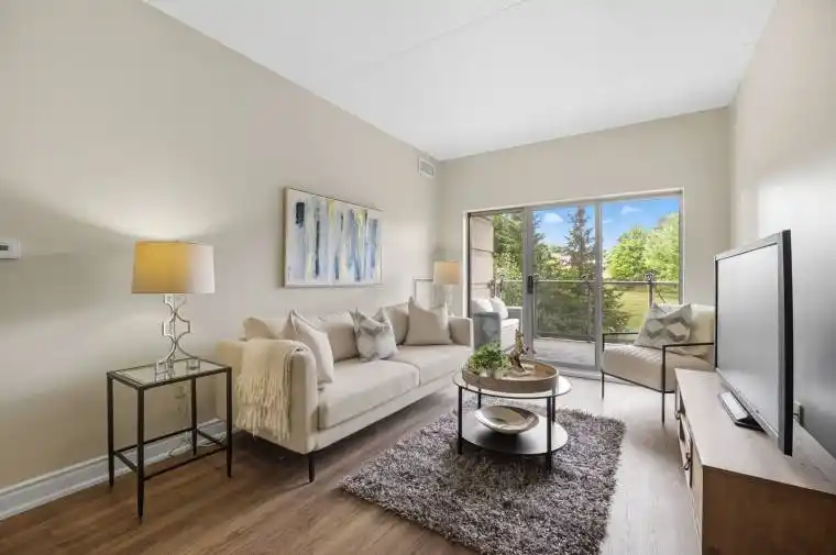 Welcome to this beautifully newly renovated large one-bedroom, two-bathroom condo with serene garden views. This move in ready home provides a serene retreat with modern touches throughout. Parking spot #16 and locker #104. Visitors parking has access to EV chargers. Step inside to find 9 foot ceilings, freshly painted interiors and stylish, updated vinyl flooring that flows seamlessly through the living spaces. The spacious living area is filled with natural light and is overlooking a peaceful field adorned with seasonal flowers, and trees. This balcony with views offer privacy and tranquility. The kitchen has been thoughtfully updated with designer finishes, offering ample cabinetry, quartz countertops, under mount sink and LG fridge with ice maker and filtered water, LG glass top range, built in microwave and fan, and LG dishwasher. These appliances have just been installed and never been used. Condo Fee is $639 per month includes FIBE cable and internet, parking, water, heat and A/C via a heat pump you own, building maintenance, and dial up security entrance. Adjacent to the entry door is washer/dryer closet. The generously sized bedroom includes 2 closets, a walk-in and standard. There is room for a desk. The Spa like en-suite bathroom newly installed carara porcelain tile, shower and tub combination. A second 2-piece bathroom adds flexibility for guests or work-from-home living. With its tranquil setting, modern updates, and thoughtful layout, this condo is an ideal choice for those seeking a low-maintenance lifestyle with all the comforts of home. The second floor is most sought after. You can move in immediately and live the good life.