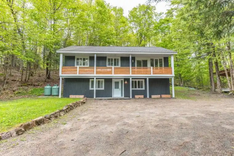 Welcome to this beautifully renovated raised bungalow, offering over 2,200 sq. ft of luxurious living space set on 1.5 acres of private, wooded land. With no visible neighbors, this home perfectly blends seclusion and tranquility, just minutes from the charming town of Minden, the Gull River, and several lakes, beaches and restaurants. The upper level features and open-concept design with stunning oak-engineered hardwood flooring throughout. The spacious living area boasts large windows that flood the space with natural light, while the electric fireplace adds warmth and ambiance. Sliding doors lead to a covered porch, providing the ideal spot for relaxation as you overlook the serene stream and lush forest. This home offers three generous bedrooms on the main level, including a large master suite with a 4-piece semi-ensuite bathroom and convenient main floor laundry. The lower level features and additional bedroom, a 3-piece bathroom and a den; perfect for guests or as a home office. The modern, sleek design includes waterproof vinyl flooring on the lower level, and the home is equipped with a UV & sediment water filter, ensuring clean and safe water throughout. Enjoy year-round comfort with a newly installed propane furnace and central air (2022). Outside, the backyard deck offers beautiful views of the surrounding forest, while the covered carport provides convenient protection for your vehicle. Modern vinyl siding and 2019 asphalt shingles complete the home’s exterior, offering both curb appeal and durability. Located near ATV and snowmobile trails, this home is a nature lover’s dream, yet still offers easy access to all the amenities of nearby towns. Whether you’re looking for a peaceful year-round retreat or weekend getaway, this home has it all. Schedule your showing today and experience the perfect blend of comfort, privacy and natural beauty.