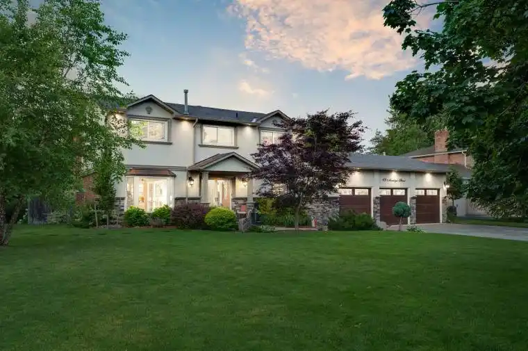 Top 5 Reasons You Will Love This Home: Beautifully designed 2-storey home flaunting updated elegant finishes inside and out, featuring a breathtaking kitchen showcased in LivingSpaces & LifeStyles magazine, four spacious bedrooms including a serene primary suite with a beautifully remodeled ensuite and a spacious walk-in closet, delivering both elegance and versatility. Thoughtfully designed with new engineered hardwood floors on the main level (2025), a refinished grand staircase updated with sleek metal pickets (2025), and a beautifully finished basement offering endless possibilities for relaxation and entertainment with ample storage, a convenient two-piece bathroom, and a large recreation room perfect for movie nights, lively get-togethers, or quiet escapes. Outside, a private backyard oasis boasts a sprawling 1,200 square foot deck overlooking peaceful greenspace with Boyces Creek running through it, ideal for summer barbecues, morning coffees, or starlit evenings, while an inground sprinkler system keeps the lush lawn vibrant with minimal maintenance required. A heated triple-car garage ensures winter comfort, and an extended driveway accommodates up to 12 vehicles, perfect for large families, overnight guests, or those who love to entertain on a grand scale. 3,310 fin.sq.ft.