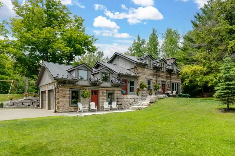 Spectacular Hewn Log Home with 3+1 bedrooms and 4 bathrooms on 2.27 acres on coveted street! This serene, expertly landscaped property boasts a fully fenced lot surrounded by mature growth trees for the utmost privacy. Entertainers dream backyard oasis with in-ground saltwater pool, hot tub and multiples patios! Meticulously renovated with modern upgrades inside and out, no expense has been spared! Enjoy the spacious kitchen with quartz countertops and large reclaimed walnut island complimented by newer appliances, living room with soaring cathedral ceilings and stone wood burning fireplace, large office, dining room with beautiful backyard views and walkout to back deck, engineered hardwood throughout the main floor. The principal bedroom boasts a vaulted ceiling and ensuite with heated floors. Upstairs bedrooms have ample storage! Bright and cheery finished basement with walkout and gorgeous views of the backyard and pool, powder room, bedroom, and ample storage with luxury vinyl plank floor throughout. Exuding character with approx. 120 year old beams and brick feature wall. Spacious two car garage and large private laneway! Hardwired security cameras and industrial LED floodlights. Plenty of outdoor storage with two Mennonite built sheds with steel roofs and a coverall. Backup generator. Some windows and doors replaced in 2024. Amazing property to live at and play on! Don’t miss it! Upgrades include: Metal roof and Pool Heater (2017), Upstairs Laminate Floor (2018), Composite Deck (2019), Front Walkway (2020), Kitchen and Landscaping (2021), Engineered Hardwood on Main Floor, Fencing, Basement Luxury Vinyl Plank, Pool Liner, Hot Tub (2022), Master ensuite and upstairs bathroom, Pool Surround, Laundry Room, Stair treads restained, spindles replaced and banister replaced (2023), Water Filtration System, Main Floor Bathroom (2024), Washer (2025), Dryer (2025).