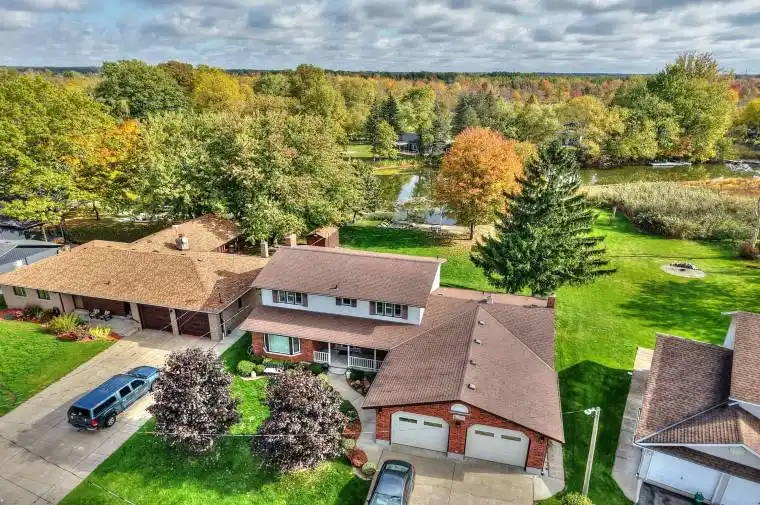Discover the charm of creekside living in this spacious 4-bedroom, 4-bath, 2-storey home nestled along the scenic Black Creek. A welcoming covered front porch leads into a bright foyer with a curved staircase to the upper level. The main floor features gleaming hardwood floors, wood doors throughout, and stylish California shutters. The family room offers a cozy gas fireplace and sliding doors to the large rear deck perfect for relaxing or entertaining. Enjoy a formal living room and dining room for gatherings, and a bright eat-in kitchen with plenty of cabinetry and hard-surface counters. A main-floor laundry room and 2-piece bath add everyday convenience. Upstairs, the primary suite includes a 3-piece ensuite and walk-in closet. Three additional bedrooms each offer double closets and share a spacious 5-piece bath with double vanity. The finished lower level provides even more living space with a recreation room, 3-piece bath, workshop, and a second walk-out. Additional features include an updated roof, windows, furnace, and A/C; a concrete driveway; and an attached 4-car garage (double wide and double deep) with walk-out access and gas powered heater in the main garage. Outside, enjoy a shed by the creek and a private U-shaped dock/deck ideal for your morning coffee, evening chats, or docking your boat. This rare property offers the perfect blend of comfort, space, and creekfront tranquility!