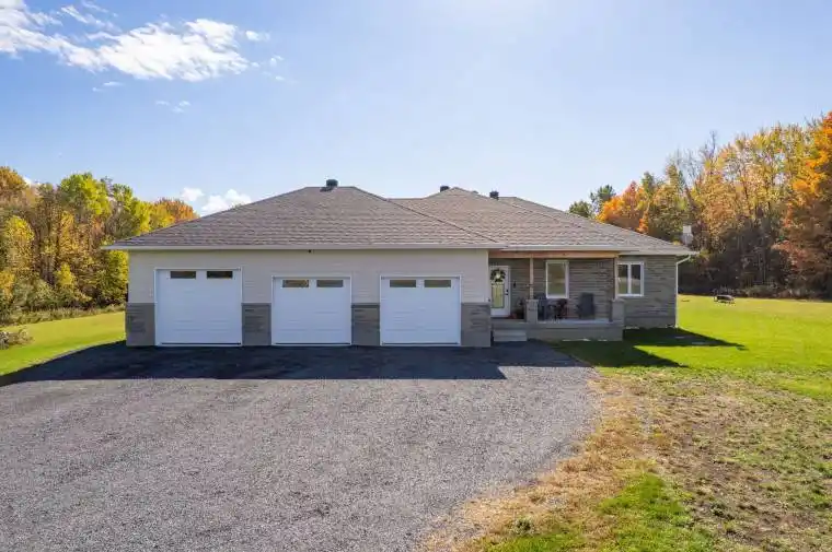 Impressive 2024 custom-built 4-bedroom bungalow offering approximately 1670 Sq.Ft. of living space, set on a beautiful 7.5-acre country lot. Built on a full ICF foundation with 9′ basement ceilings and equipped with a Generac backup generator capable of powering two homes, this property combines craftsmanship and efficiency throughout. The open-concept main level showcases a stylish kitchen with birch soft-close cabinetry, built-in double oven/microwave, large centre island, and coffee bar, flowing seamlessly to a bright living room with custom entertainment unit and access to a covered rear porch. The 1250 Sq. Ft. triple attached garage impresses with in-floor heating, arena lighting with three dedicated breaker zones perfect for shop work. Heating is supplied by an outdoor remote Heatmor wood furnace and or propane that also provides domestic hot water and in-floor radiant heat to both the home and garage. Additional highlights include over-insulated attic, in-floor basement heating with separate garage access, pre-run conduits for future Fibe/internet, gas BBQ hookups, full home network wiring, multiple Wi-Fi boosters, and a security system with backup power. Approval for secondary dwelling or shop therefore well and septic are designed for future expansion with a second driveway in place making this an exceptional opportunity to enjoy modern country living with superior utility systems and thoughtful design. Please allow 24hr irrevocable on all offers.
