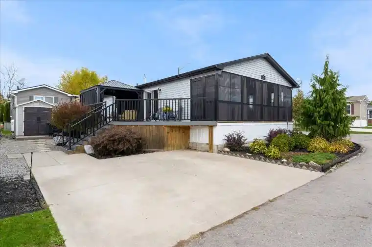 Standout Living in Lost Forest Park! Set yourself apart in this one-of-a-kind 2-bedroom, 2-bath modular home, offering a rare combination of cathedral ceilings, open-concept design, and resort-style living in Burlington’s exclusive gated Lost Forest Park! Inside, the soaring vaulted ceilings create a bright and airy feel, while the stainless-steel appliances and thoughtful layout make everyday living both stylish and functional. With two full bathrooms, a crawl space for convenient storage, and even a generator for peace of mind, this home is designed with both comfort and practicality in mind! Step outside to your very own retreat including a wrap-around porch with an inviting sunroom adding 147 sq. ft. of covered enjoyment year-round and overlooking the stunning gardens! Enjoy cozy afternoons in the charming gazebo or quiet evenings under the stars from your comfy deck! It’s the perfect spot to unwind and take in the beauty of your surroundings. It is a space designed for both relaxation and entertaining! Best of all, this home is set on a private corner lot, offering extra space, quiet surroundings, and enhanced privacy, making it one of the most desirable locations in the park! A handy storage shed adds extra functionality, while the double car driveway makes parking and manoeuvring a breeze! Beyond your doorstep, you’ll enjoy all the benefits of Lost Forest Park living including a gated security, a seasonal pool, walking trails, community centre, and serene forested surroundings! With low land lease fees, this home is a fantastic choice for first-time buyers, downsizers, or those ready to travel and enjoy life without the stress of high maintenance! This isn’t just another listing! It’s a lifestyle upgrade in one of Burlington’s most unique and welcoming communities! Don’t miss your chance to call Lost Forest Park home where nature, comfort, and convenience come together beautifully!
