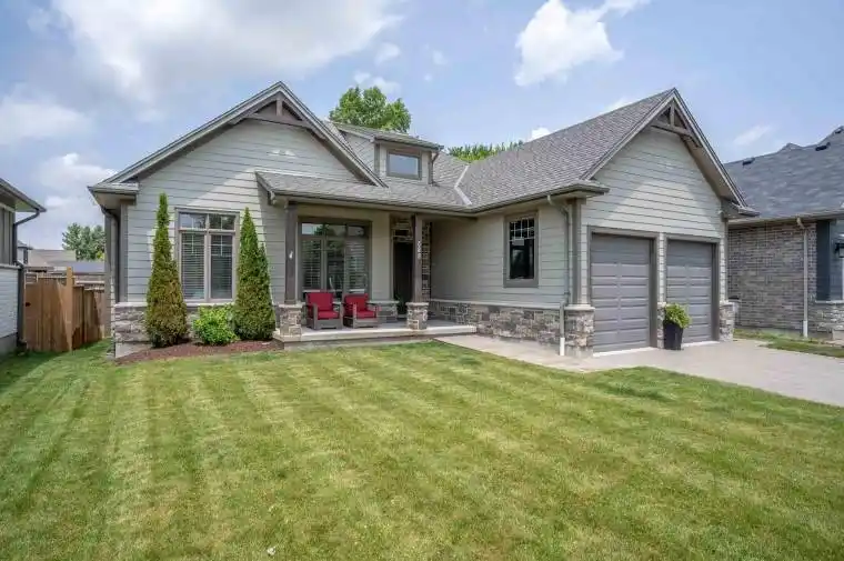 A stunning bungalow in the highly sought-after Woods Edge subdivision of Mount Brydges, where small-town charm meets modern living. This beautifully maintained 3+1 bedroom, 3 bathroom home offers exceptional comfort and functionality, starting with a bright, airy foyer featuring an extended ceiling and transom window that flows seamlessly into the formal dining room. The open-concept living area features a cozy gas fireplace and tray ceiling and is open to the kitchen that impresses with quartz countertops, a walk-in pantry, gas stove, stainless steel appliances. Beside the kitchen there is a breakfast area leading out to a large sun deck with gazebo, natural gas BBQ hookup, and a fully fenced backyard. Hardwood floors run throughout the main living areas, with tile in the kitchen, bathrooms, and foyer for both style and durability. The main floor hosts a spacious primary suite with walk-in closet and luxurious five-piece ensuite, plus two additional bedrooms and a four-piece bath on the opposite side for privacy. Convenient main-floor laundry connects to the insulated, heated double garage featuring a natural gas heater, air purifier, and side entry. The fully finished lower level includes a fourth bedroom, office space, huge family room with projector and screen, and an infrared entertainment system. Outside, enjoy the hot tub, garden shed, fire pit, lawn irrigation system fed by a sandpoint well, and private yard backing mature trees. Located close to all amenities including parks, school, the arena, and the community center and just minutes from the 402, Strathroy and West London.