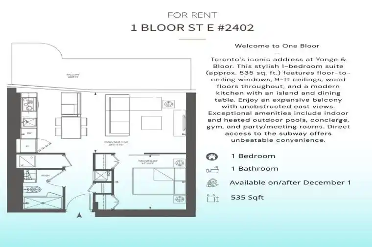 Welcome to One Bloor. Toronto’s most iconic address at Yonge & Bloor. This stunning 1-bedroom suite offers approx. 535 sq. ft. of thoughtfully designed living space with floor-to-ceiling windows, soaring 9 ft ceilings, and wood flooring throughout. Enjoy an unobstructed east-facing view from the expansive balcony, perfect for morning coffee or evening relaxation. The sleek, modern kitchen features a built-in island with a dining extension, ideal for both everyday living and entertaining. Residents enjoy world-class amenities including indoor and heated outdoor pools, a fully equipped gym, party/meeting rooms, and 24-hour concierge service. Direct subway access connects you seamlessly to the entire city. Experience luxury living in the heart of Toronto.