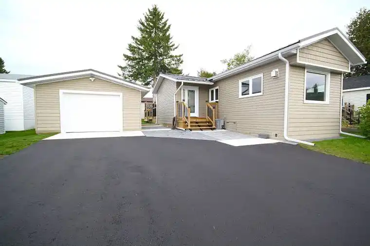 WOW! NEW, NEW, & MORE NEW! Completely renovated or rebuilt inside and out. This move in ready 2 bedroom 2 bathroom home has been recreated just for you to enjoy for many years to come. Excellent layout provides a walkout to large private deck off primary bedroom, bonus office with closet and attached 1/2 bath, large foyer with coat closet, covered porch, open concept kitchen with cozy gas fireplace. Too many upgrades to list…featuring all NEW in 2024/25; steel roofs on all 3 buildings, siding, soffit, fascia, troughs, exterior lighting, huge new asphalt driveway, paver stone, all new windows, and new exterior doors, new decks, upgraded insulation, new drywall, all new flooring, totally new bathroom, 5 brand new appliances, new kitchen, new central air unit, all interior trim & doors, and paint, new pot lighting and light fixtures, and much much more! Walk out to large private deck. Pride of ownership and attention to details abound. Garage was taken down to foundation and rebuilt with new framing, insulated walls and doors, windows, garage door opener, and hydro. Amazing opportunity. Located close to Orillia and major amenities. Land lease fee includes road maintenance, garbage removal.
