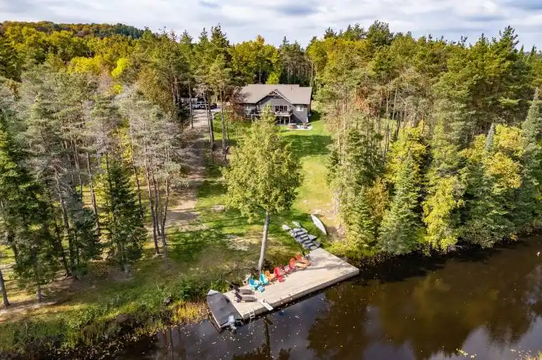 This is it! The complete package, sitting on about 4.5 acres just minutes from Hwy 11 this large custom home has a triple attached garage, walkout basement and around 400′ of waterfront just a stones throw from Mary Lake. Offering direct access to beautiful Mary lake and the 4 lake chain, this unique property has quiet and private dockage in the river with no neighbours across spoiling the serene view. The home was custom built in 2019 with quality finishes and a smart layout, it features a main floor primary suite, main floor laundry, a huge deck overlooking the expansive yard and river, and a walkout basement. The triple attached garage has a large loft currently used for storage but could be finished to suit your families needs. The large steel pile dock is great for lounging at the waters edge while the poured concrete patio is perfect for a campfire or to enjoy a soak in the wood fired hot tub under the stars. Extremely private, well thought out and the best of all worlds, this four season home or vacation property ticks so many boxes. Call for your private tour.