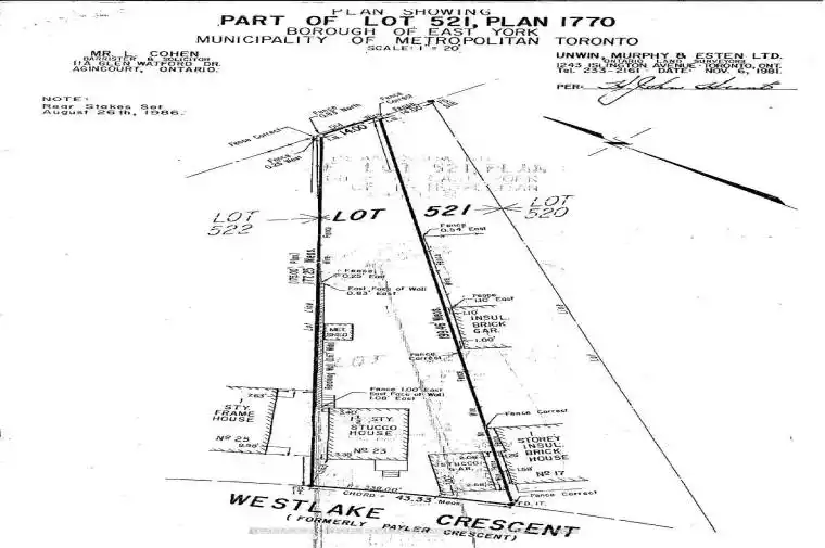 ***ATTENTION BUILDERS*** Welcome to 23 Westlake Cres. in Beautiful East York. This home was built in 1936 and is being sold “As Is” (Land Value Only). This exceptional lot is over 175′ deep and backs directly onto “Taylor Creek Park”. Featuring over 43′ frontage (narrowing at the back), this presents an incredible opportunity for someone who wants to build their own brand new home in a spectacular location! **EXTRAS** Existing Fridge, Stove, Washer, Dryer, Electric Light Fixtures, Broadloom Where Laid, Gas Burner and Equipment, Central Air Conditioner, HWT (R) (All “As Is”)