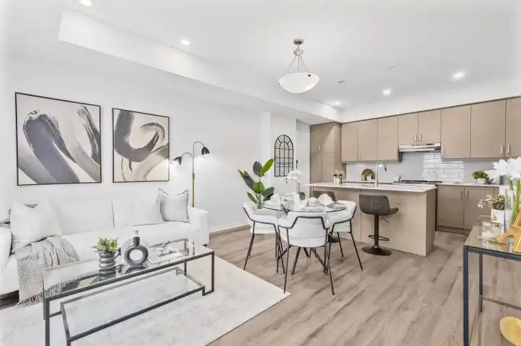 Comes with 2 parking spaces. Luxury 3-bedroom, 2.5-bath back-to-back townhouse(not stacked) in the heart of Vaughan Metropolitan Centre, located in the sought-after Mobilio Towns by Menkes. This bright east-facing home overlooks a newly built park and playground with unobstructed views and abundant natural light throughout. A future 11-acre central park on the north side of the property will provide even more green space and recreational opportunities. Featuring 9 ft ceilings on all levels, engineered smart flooring, large windows, and premium builder upgrades including plenty of pot lights and a glass shower door, plus custom window blinds (not the builder’s original vertical blinds). The open-concept kitchen offers quartz countertops, stainless steel appliances, and a center island with double sinks. The primary suite includes a private balcony, a 6-piece ensuite with double sinks, and a walk-in closet. Enjoy a spacious rooftop terrace perfect for outdoor gatherings. Steps to Vaughan Metropolitan Subway Station (approx. 40 minutes one ride to Union Station), across from IKEA, and minutes to York University, Vaughan Mills, Costco, Canada’s Wonderland, and major highways 400, 407, and Hwy 7.