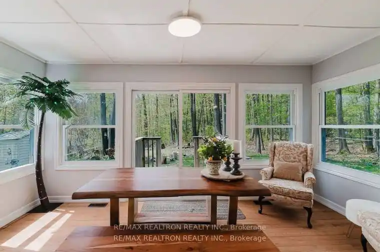 Welcome to this bright and peaceful home with a brand new kitchen, ideally located just minutes from Midland, the marina, and the shores of Georgian Bay. Nestled on a beautifully treed0.81-acre lot, this low-maintenance property offers privacy and a serene natural setting. A newer composite front deck and double front doors invite you into the spacious great room, featuring cathedral ceilings, large windows for abundant natural light, and a cozy gas fireplace with thermostat control. A full-season sunroom-perfect as a home office-overlooks the tranquil backyard, providing the perfect spot to relax or work surrounded by nature. This unique bungalow layout features a split-bedroom design for added privacy. The eat-in kitchen includes a pantry and a walkout to the back patio, with convenient access to the1.5-car garage. There’s also a separate laundry and storage room. The primary bedroom includes a walk-in closet and a private two-piece ensuite. The crawl space is spray-foamed, accessible from both inside and outside, and offers generous headroom for additional storage. This home is ideal for first-time buyers, retirees, or as a recreational getaway in a quiet, peaceful area. You must see!