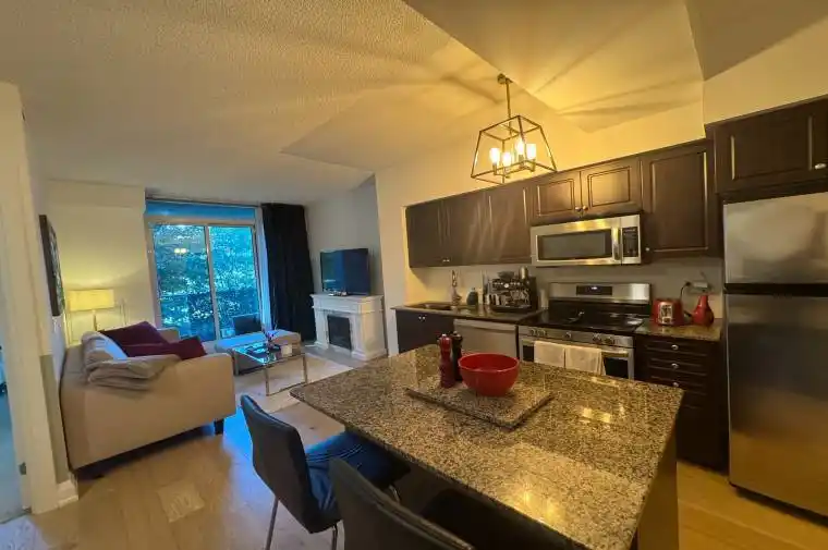 This magnificent 638 sq. ft. open-concept, 1 + den condo offers a perfectly designed layout with not a single inch wasted. Highly updated throughout, it features custom built-in closets, upgraded lighting, stainless steel appliances, and granite countertops. The spacious living area opens onto a west-facing balcony, providing a bright and inviting space ideal for relaxing. The building offers exceptional amenities, including a 24-hour concierge, gym, indoor pool, two hot tubs (one on the rooftop deck with BBQs), sauna, billiards room, party and dining room, guest suites, and visitor parking. Conveniently located with TTC right at your doorstep, this unit also comes with parking and is situated on the same floor as the amenity space-offering unmatched convenience and accessibility.