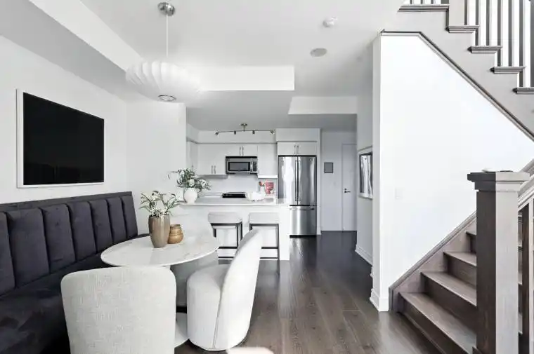 Sun-soaked, soaring, and surprisingly private. This two-storey townhouse offers a rare blend of house-like living and condo convenience. Step inside and you’re greeted by 18-foot ceilings, a dramatic wall of windows, and a south-facing exposure that floods the space with light all day long. Mid-afternoon, the sun streams into the living room in a way that makes you stop and just take it in. The open main floor is designed for both entertaining and everyday living. The kitchen, complete with a full-sized fridge, warm hardwood flooring, and gold accents, connects seamlessly with the living and dining areas. A custom banquette sets the stage for long dinners with friends, while the fireplace with marble trim adds a cozy focal point in the colder months. Step out to your oversized terrace and watch cotton-candy sunsets melt into the city skyline. From here, the CN Tower sparkles at night, and a tree just outside the living room window makes it feel like your own little green oasis in the heart of downtown. Two bedrooms and a full bath upstairs. A powder room on the main floor. Smart storage throughout. And yes, your own parking spot. Everything in its place, exactly where it should be. Life here is all about balance: a private ground-floor entrance that makes life with a dog easy, paired with the full-service amenities of the building including concierge, pool, hot tub, and steam room. The neighbourhood? Steps to the lake, Trillium Park, and some of the best food, fitness, and culture in the city. From yoga in the park and run clubs along the waterfront to date night at Nodo or coffee at Balzacs, this is downtown living that doesn’t compromise.